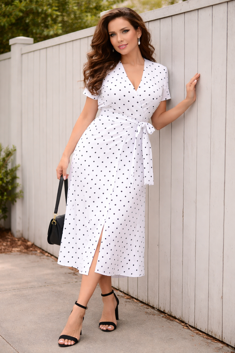 В центре этого образа — белое платье с запахом, где диагональная линия задаёт всю геометрию силуэта. Обратите внимание, как запах формирует мягкий V-образный вырез и одновременно «собирает» фигуру по центру, не создавая лишнего объёма.