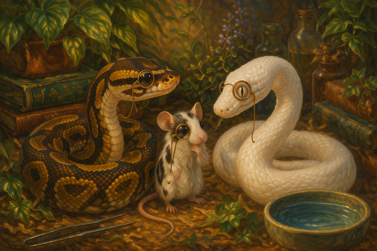 Если посмотреть на разных королевских питонов, можно легко запутаться: у одних глаза кажутся почти чёрными «бусинками», у других — голубые, у третьих — с чётким вертикальным зрачком, как у кошки. Создаётся ощущение, будто у змей бывают «разные типы глаз». На самом деле — нет. Конструкция глаза у всех одна и та же. Разница исключительно в том, как он выглядит. Давайте разберемся вместе. У всех королевских питонов: То есть базовая «механика» не меняется ни от морфы, ни от пола, ни от возраста. Никаких «круглых» или «других» зрачков у них нет — просто иногда их не видно. Главный фактор — количество пигмента. Отсюда и эффект «чёрных бусинок» — зрачок есть, просто он замаскирован. Иногда можно заметить странный эффект: глаз будто переливается красным, а внутри «вдруг появляется» зрачок. Это не мистика и не особенность конкретной змеи, а обычная оптика: При другом угле всё снова выглядит как сплошной тёмный глаз. Как и у кошек: Но есть нюанс: