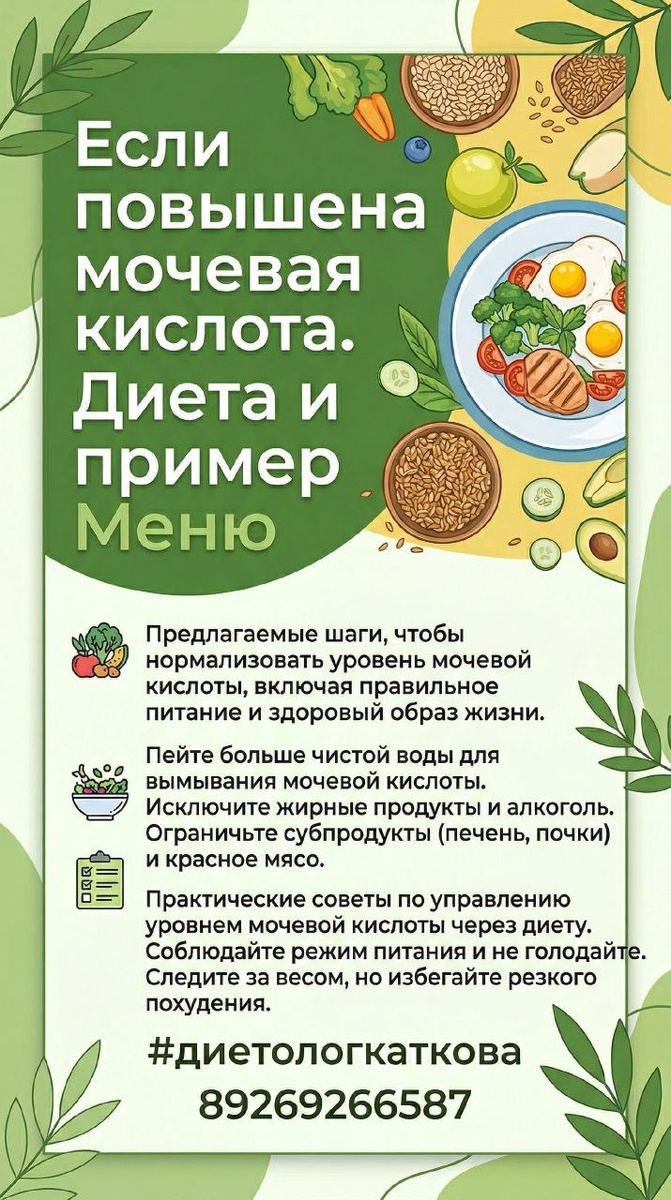 : Повышена мочевая кислота , терапевт рекомендаций не дал. Как питаться? Что можно? Диета при повышенной мочевой кислоте направлена на снижение поступления пуринов с пищей, нормализацию обмена веществ и выведение мочевой кислоты почками. Основные принципы: Исключить или ограничить - Красное мясо (говядина, свинина, баранина). - Субпродукты (печень, почки, мозги). - Жирную рыбу (скумбрия, сардины, сельдь). - Морепродукты (анчоусы, креветки, мидии). - Бульоны (мясные, рыбные, грибные). - Бобовые (горох, фасоль, чечевица). - Овощи: шпинат, щавель, цветная капуста, спаржа. - Грибы. - Сыры с высоким содержанием соли. - Сладкие газированные напитки, соки с фруктозой. - Алкоголь (особенно пиво и ликёры). - Копчёности, маринады, жареные блюда. Рекомендуется - Молочные продукты низкой жирности (кефир, творог, йогурт). - Овощи: огурцы, картофель, морковь, кабачки, тыква, капуста. - Фрукты и ягоды: яблоки, груши, сливы, вишня, цитрусовые. - Крупы и макароны. - Хлеб из муки 2 сорта. - Орехи в