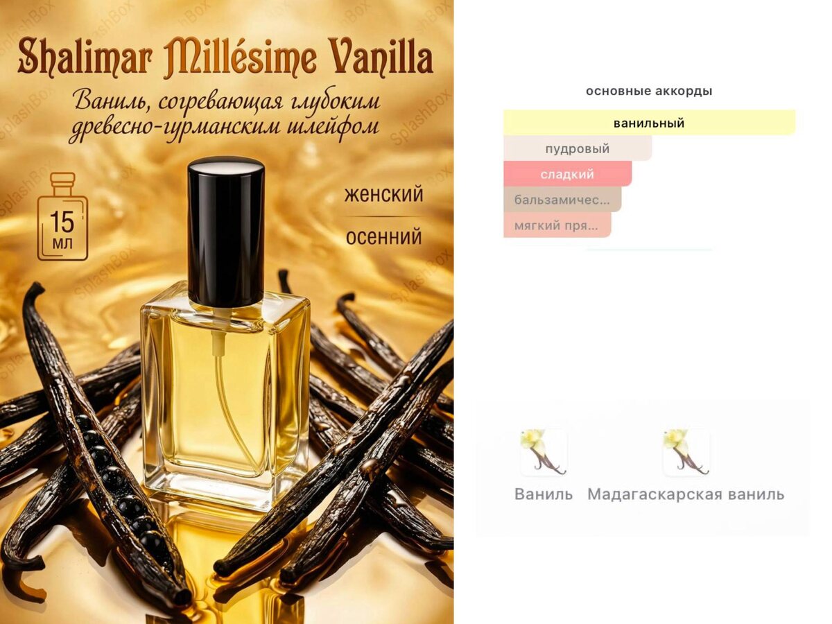 ✨✨✨✨✨✨✨✨✨✨ ✨✨✨✨✨✨ ✨✨✨ ✨✨✨✨✨✨✨✨✨✨ Доброе воскресное утро! 🍵🌤💓 Прохладным утром захотелось чего-то уютного согревающего, поэтому мой аромат дня 🌼Shalimar Millesime Vanilla - аромат ванили, согревающей глубоким древесно-гурманским шлейфом 🌟 Арт. 922595054 💙 Арт. 3774851908 ✨Аромат-референс: Shalimar Millésime Vanilla Planifolia Guerlain Восточный, чувственный, восхитительный, передозированный. Дань уважения ванили. В этом лимитированном выпуске мадагаскарская ваниль планифолия превосходно и необычно усовершенствована парфюмерами: ванильная настойка источает древесный, слегка кожаный и пряный мотив. Это исконное ноу-хау, позволяет извлекать молекулы аромата ванили путем мацерации в спирте, полученном в результате органического земледелия. Экстракт ванили высвобождает чувственную гурманскую нотку. Этот метод позволяет извлекать молекулы аромата путем мацерации и перколяции стручков, привезенных с Мадагаскара. ✨Пирамида: Ваниль и Мадагаскарская ваниль ✨Звучание: В аромате п