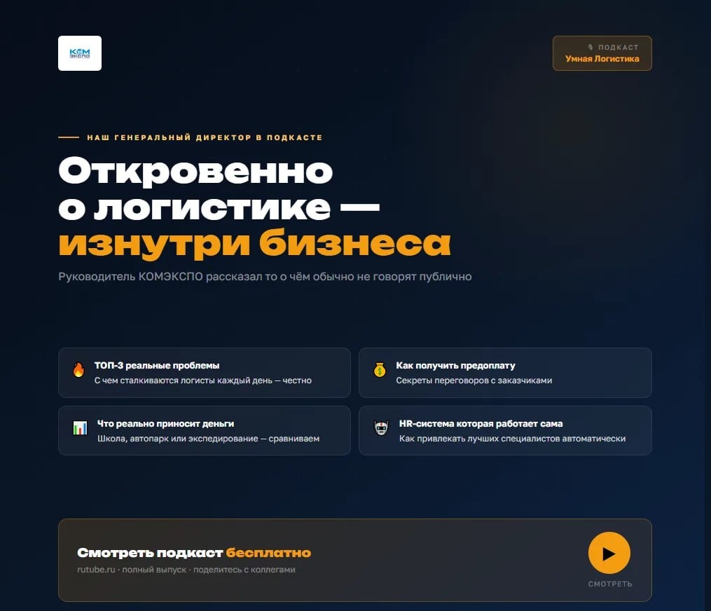 Если вы думаете о логистике — этот выпуск для вас. Руководитель КОМЭКСПО пришёл на подкаст к партнёрам и говорил честно: про бизнес изнутри, про деньги, про то как всё устроено на самом деле. Узнаете: 🔥 С какими проблемами сталкиваются логисты каждый день — и как их решают 💰 Как зарабатывают в логистике — цифры и реальность 📊 Что выгоднее: своя школа, автопарк или экспедирование 🤖 Как выстроить работу так чтобы система работала сама Это не реклама. Это разговор людей которые в теме. Смотреть бесплатно 👇 https://rutube.ru/video/f63c26c810a4d7847d8da855567578f7/ Посмотрели? Напишите что думаете 👇