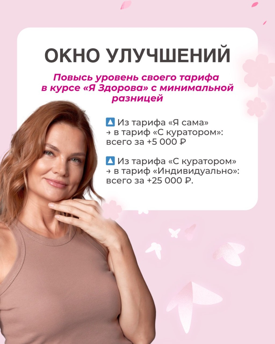 🔥 На ближайшие 48 часов мы открываем Окно Апгрейда! 🔥 Это возможность получить уровень поддержки выше на специальных условиях Как сделать апгрейд? (только 5 и 6 апреля) 🔜 Повысьте свой тариф, доплатив небольшую разницу: ‼️ Из тарифа «Я сама» → в тариф «С куратором»: всего за +5 000 р. ‼️ Из тарифа «С куратором» → в тариф «Индивидуально»: всего за +25 000 р. 🎁 Бонусы, которые вы получаете вместе с Апгрейдом: 💎 Психологический разбор работа с ментальными блоками, которые мешают физическим изменениям 💎 Модуль «Королевская грудь» упражнения для лифтинга зоны декольте и коррекции осанки 💎 Меню на 2 недели готовый рацион для поддержки ресурса организма Текущая стоимость тарифов «Я Здорова» • Я сама — 32 990 р. • С куратором — 49 990 р. • Индивидуально — 99 990 р. Используйте эту возможность, чтобы забрать максимум пользы и поддержки кураторов 👉 Сделать апгрейд уже имеющегося тарифа 👉 Зайти на курс «Я Здорова»