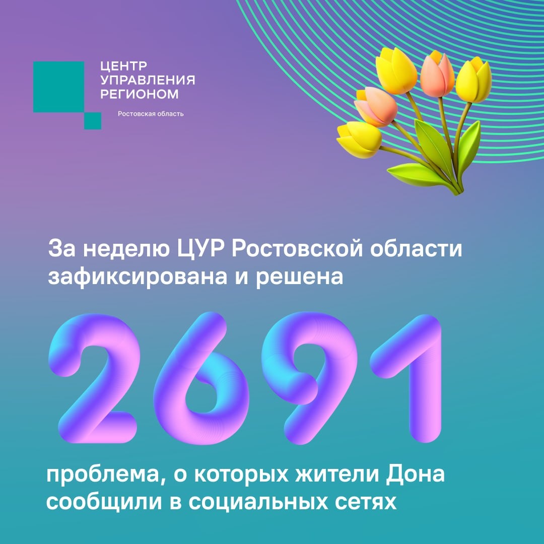 ! 📩За это время Центр управления регионом Ростовской области зафиксировал и решил 2691 проблему, о которой жители Дона сообщили в социальных сетях. Подробнее - в инфографике📊 #цур61 #решаемвместе61 #цурвцифрах #Ростовскаяобласть