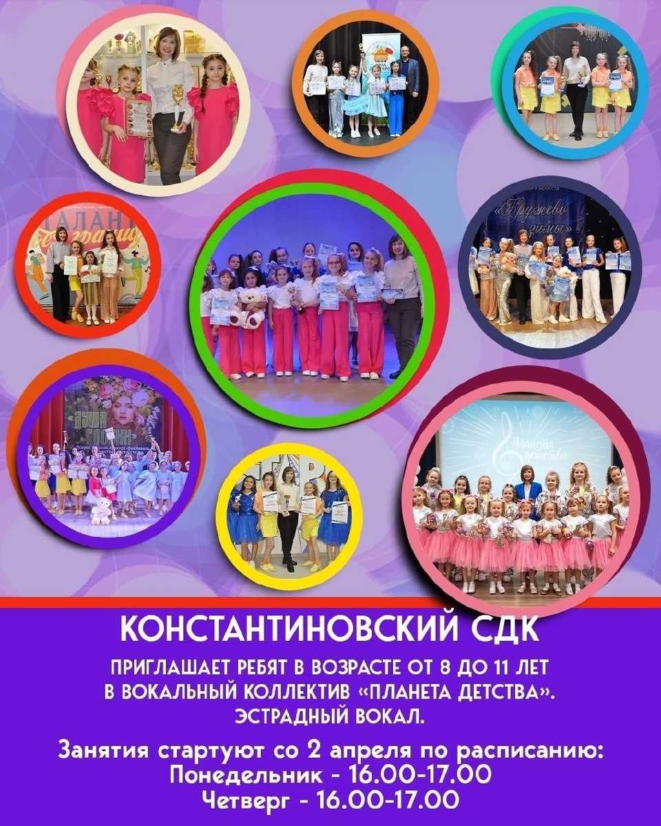 ✨ 🎤✨ Открыт набор в вокальный коллектив «Планета детства»! Константиновский СДК приглашает детей 8–11 лет на занятия по эстрадному вокалу 🎶 Участники коллектива — лауреаты и обладатели Гран-При конкурсов различных уровней 🏆 👩🏫 Руководитель — Карина Анатольевна Пахорукова Педагог с высшим образованием, стаж работы более 13 лет, лауреат международных профессиональных конкурсов, награждена благодарностями за высокий профессионализм 🏢 Константиновский сельский дом культуры (СДК) 📍 г.о.Домодедово, пос.Государственного племенного завода Константиново, ул.Гагарина, д.1А ✅ Мероприятия Домодедово https://dzen.ru/id/66f10385cc4c5a16f7b5fb02 https://vk.ru/domodedovo_events http://dzen.ru/domodedovo_events