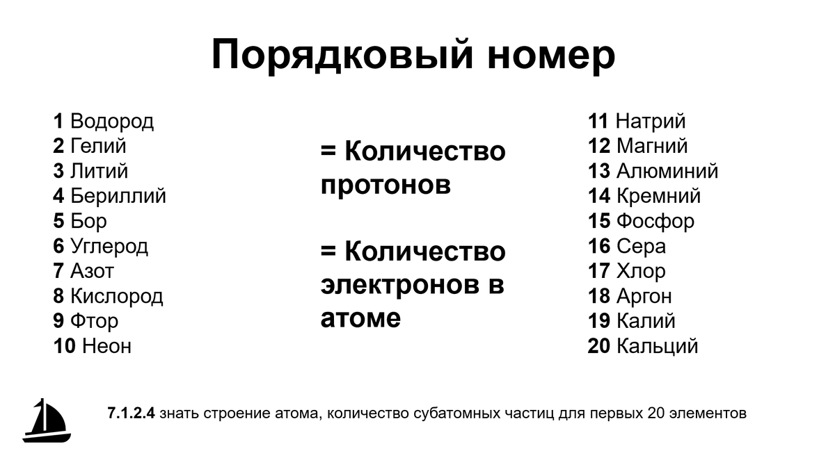 Зная порядковый номер первых 20 химических элементов, относительную массу и заряд субатомных частиц, а также их расположение в атоме, можно дать описание состава атома. Количество протонов в ядре атома - уникальная величина, которая напрямую соответствует названию и символу только одного химического элемента. И обратно, зная название или символ химического элемента, можно однозначно утверждать о количестве протонов в ядре этого химического элемента. Количество электронов в атоме равно количеству протонов. Однако, количество электронов не привязано так прочно к порядковому номеру химического элемента как привязано к нему количеству протонов. Количество электронов может отличаться от порядкового номера химического элемента, но в этом случае частица будет уже не атомом. (О существовании частиц, где количество электронов может быть отличным от количества протонов Вы узнаете позднее). Атом электронейтрален, поэтому количество частиц с противоположными зарядами должно быть одинаково. То ест