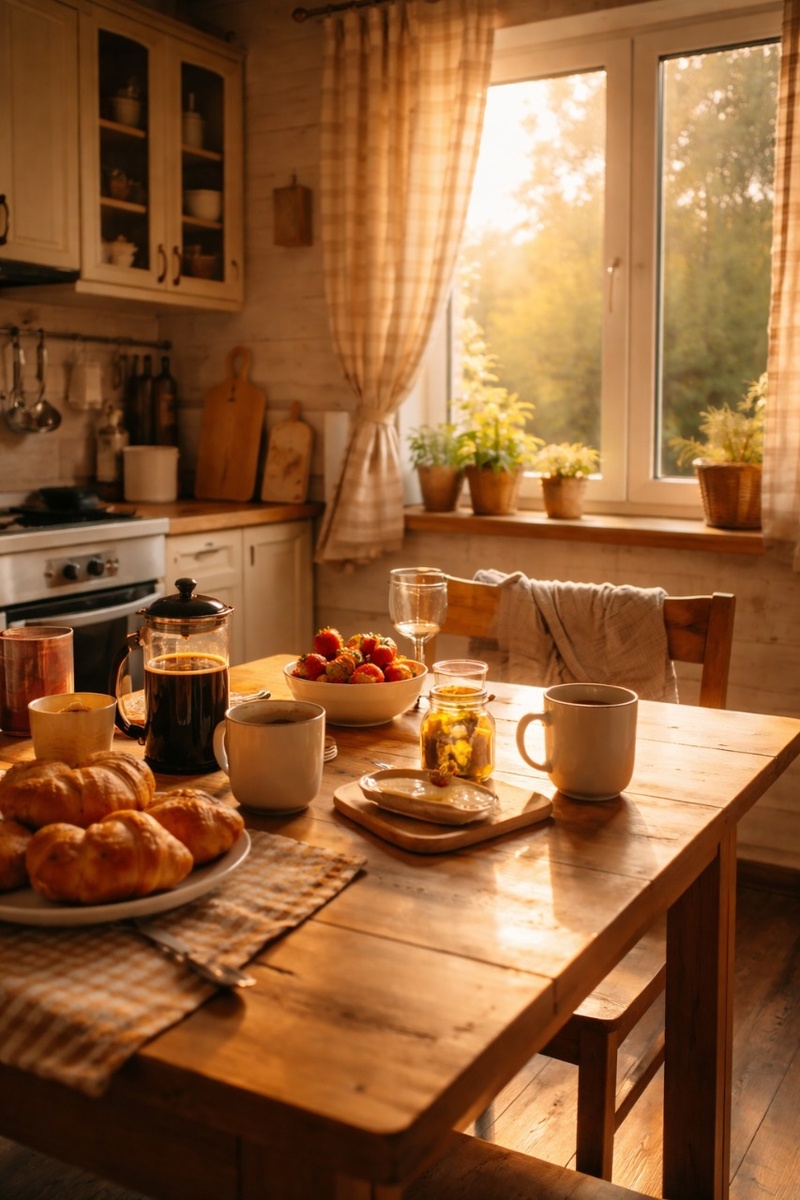 Не полностью, конечно. Дом есть дом. Где-то кружка звякнула, где-то дверь во двор открылась, где-то сын уже с утра что-то ищет и не может найти. Но в этом всём нет главного — спешки. Никто не смотрит каждые пять минут на часы. Никто никого не подгоняет. И день от этого начинается совсем иначе.