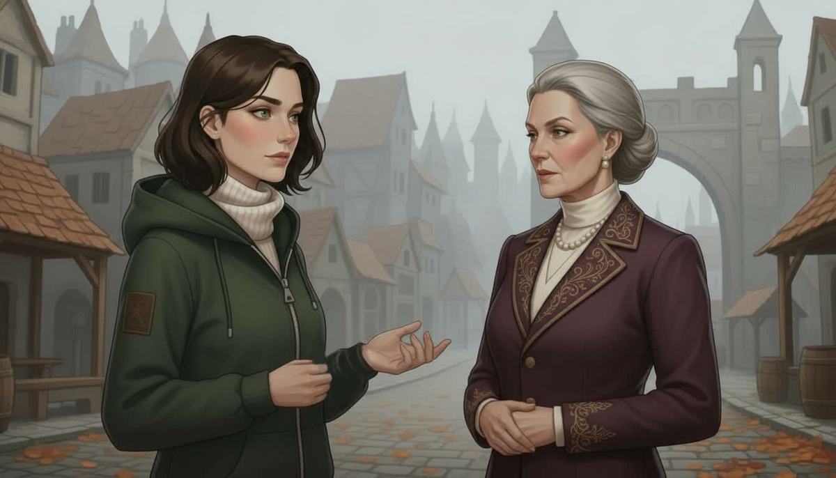 Вон там, на углу, где раньше стоял ларёк с шаурмой, теперь красовалась лавка с вывеской, которую Юля не могла прочитать, потому что буквы были какие-то... витиеватые. Старинные. Не наши. Люди шли по улице. Обычные люди. В куртках, шапках, с сумками. Но что-то в них было не так. Одежда? Нет, одежда нормальная. Походка? Тоже нормальная. Но вот женщина, которая прошла мимо, мелькнула плащом, и на секунду Юле показалось, что плащ этот не из болоньи, а из тяжёлой ткани, и на плече у неё не сумка, а...