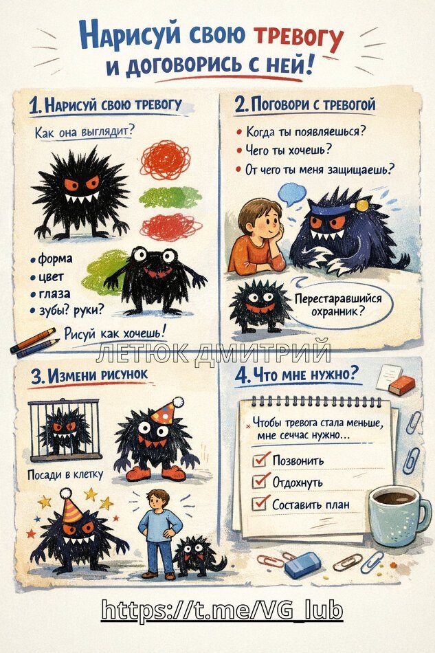 Сегодня совет о том, как можно самостоятельно уменьшить тревожный фон. Сразу скажу — это далеко не терапия и не анализ, а небольшой лайфхак, направленный на временное облегчение. Сохраняйте картинку, может пригодится.