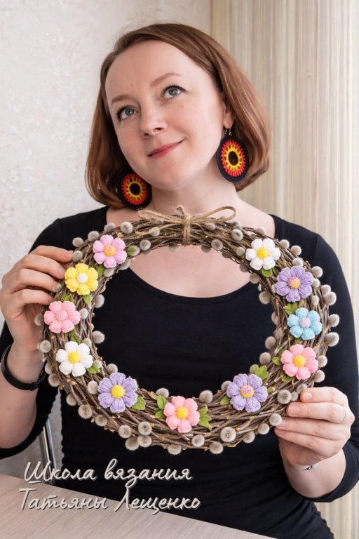 Я использовала остатки пряжи разных цветов: нежно-розовый, голубой, жёлтый, сиреневый и белый. Каждый цветочек вязала по простой схеме. Идеи, как использовать такой венок: А вы как отмечаете Вербное воскресенье? Делаете ли вы что-то своими руками к этому дню? Может, вяжете салфетки под куличи, игрушки для детей