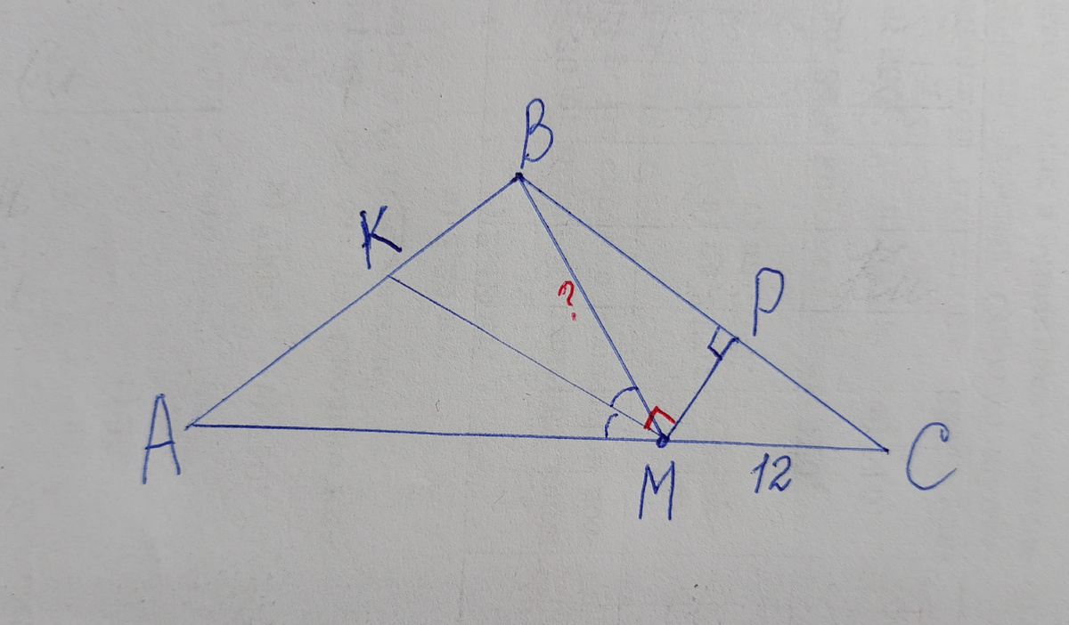 В треугольнике АВС на стороне АС отметили произвольную точку М. В треугольнике АВМ провели биссектрису МК. В треугольнике СВМ построили высоту МР. Угол КМР=90°, СМ=12. Найдите ВМ.