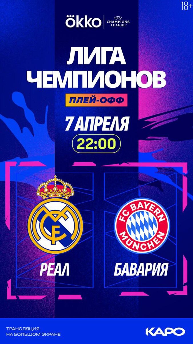 7 и 8 апреля в Москве и Санкт-Петербурге показываем прямые трансляции матчей 1/4 финала плей-офф Лиги чемпионов УЕФА на большом экране. Будет жарко!🔥