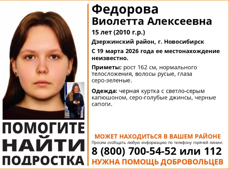 В Новосибирске продолжаются поиски 15-летней Виолетты Федоровой. Местонахождение подростка остается неизвестным с 19 марта 2026 года. Информацию о пропаже девочки распространили волонтеры поисково-спасательного отряда. Виолетта проживает в Дзержинском районе города. Спустя более двух недель поисков близкие и правоохранительные органы все еще не имеют сведений о том, где может находиться подросток. Приметы пропавшей: Рост: 162 см. Телосложение: нормальное. Волосы: русые. Цвет глаз: серо-зеленые. В чем была одета: В день исчезновения на девочке была черная куртка со светло-серым капюшоном, серо-голубые джинсы и черные сапоги. Волонтёры отмечают, что ребенок может находиться в любом районе города. Всех, кому что-либо известно о местонахождении Виолетты Федоровой или кто видел ее в последнее время, просят незамедлительно сообщить информацию по телефонам: 8 (800) 700-54-52 (горячая линия волонтеров); 112 (единый номер экстренных служб).