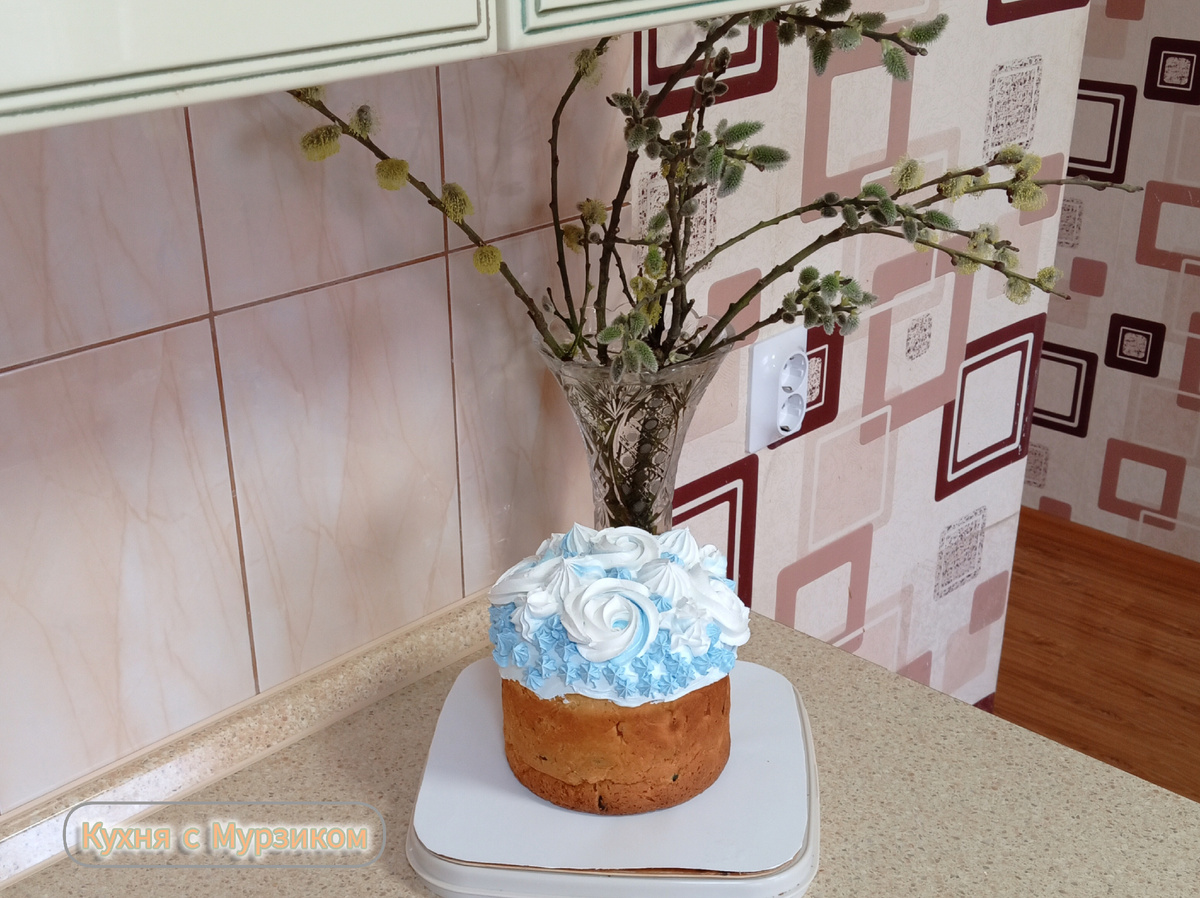 9. Для глазури: смешайте белки с сахарной пудрой, нагрейте на водяной бане до растворения сахара, взбейте до густых пиков. Добавьте лимонный сок. По желанию подкрасьте. Украсьте куличи.
