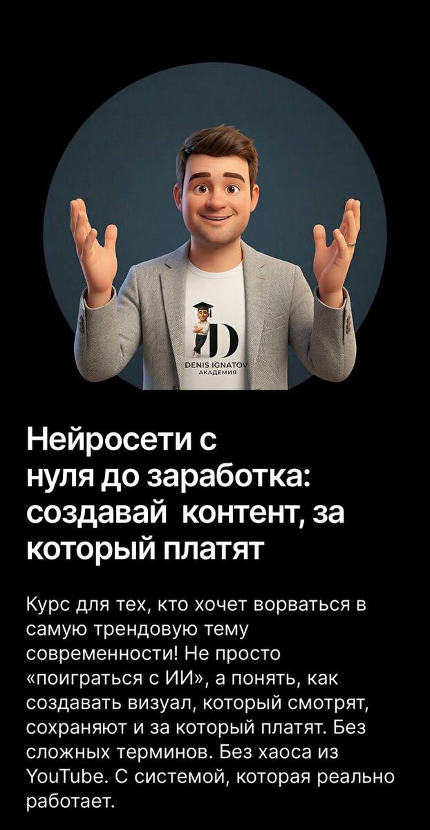 Быстрый и понятный старт для новичков, как с нуля освоить базовый уровень нейрографики и нейроанимации! Понять что и как делать, что залетает а что сегодня уже не работает. Получишь практические навыки и сможешь сразу начать зарабатывать на ИИ. . А также приятные бонусы в виде большого гайда по nanoBanana и урока по созданию современных карточек для маркетов в ИИ. . Курс проходит на удобной платформе GetCource (с браузера и или приложения) Все инструменты Ии в курсе не требуют смены айпи и наличия зарубежных карт. Вся информация тут: https://neyroacademia.ru/denis-ignatov https://neyroacademia.ru/denis-ignatov https://neyroacademia.ru/denis-ignatov Вэлком 🤗