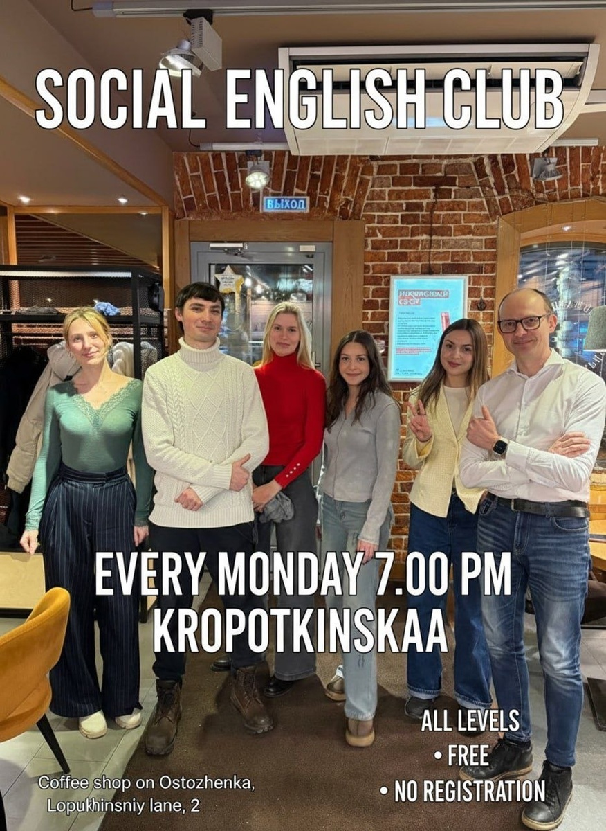 И уже несколько месяцев я веду свой разговорный клуб 🗣️🏴 Каждый понедельник мы собираемся в уютной кофейне у метро Кропоткинская, чтобы просто болтать, знакомиться и практиковать язык без стресса и оценок. Формат простой: • общаемся 1 на 1, каждые 15–20 минут меняем собеседника • темы и вопросы — только подсказки, говорим о чём хотим • уровень любой, главное — желание говорить ☕️ Клуб бесплатный, единственное условие — сделать заказ на кассе (чай, кофе, что‑то вкусное). Я буду рад увидеть всех в гостях — и тех, кто уже был, и тех, кто только присматривается. Приходите знакомиться, практиковать английский и просто хорошо проводить время 🌟 📍 м. Кропоткинская, Кофейня на Остоженке (Лопухинский пер., 2) ⏰ Каждый понедельник, 19:00 До встречи в понедельник! 👋