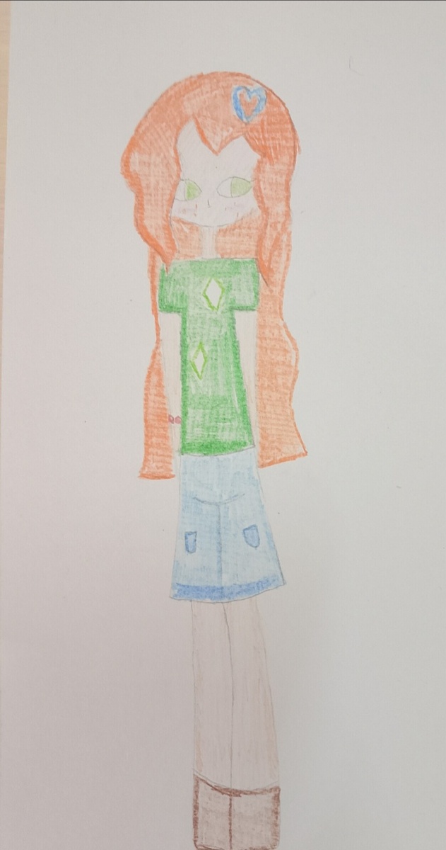Джинсы синие, кофта зелёная с рисунком, волосы рыжие, глаза зелёные и есть веснушки...