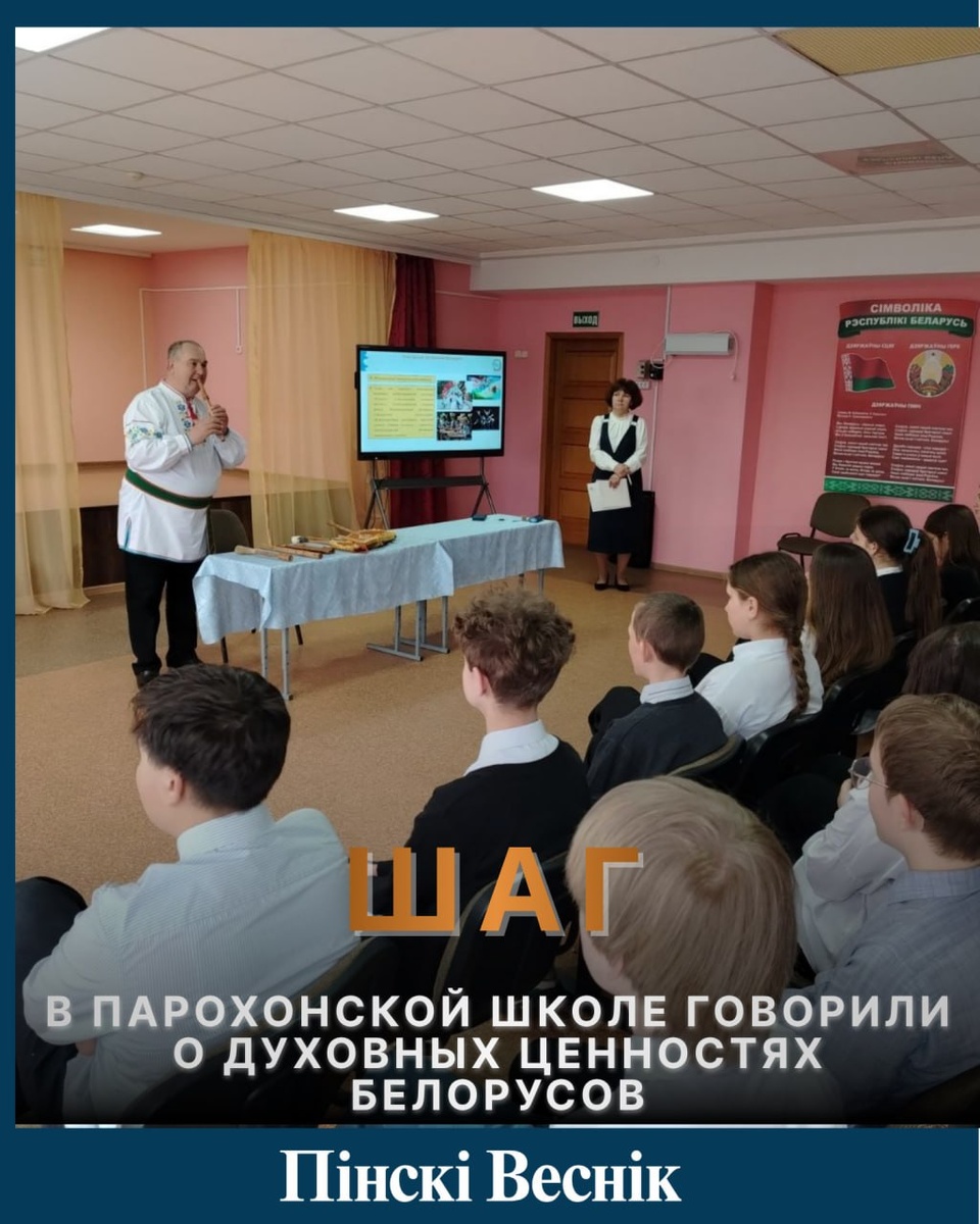 🏷Очередную встречу проекта «ШАГ» посвятили теме достойного гражданина и духовного наследия страны. ⏩Гостем стал директор Парохонской ДШИ Петр Соломянюк - мастер по изготовлению деревянно-духовых инструментов и основатель духового оркестра. Он рассказал школьникам о значении традиций, культуры и исторической памяти. @Пинский Вестник 📱Ютуб 📱ВК 📱ИНСТАГРАМ 📱ОК 📱ФЕЙСБУК 📱ТИК ТОК Сайт Прислать новость