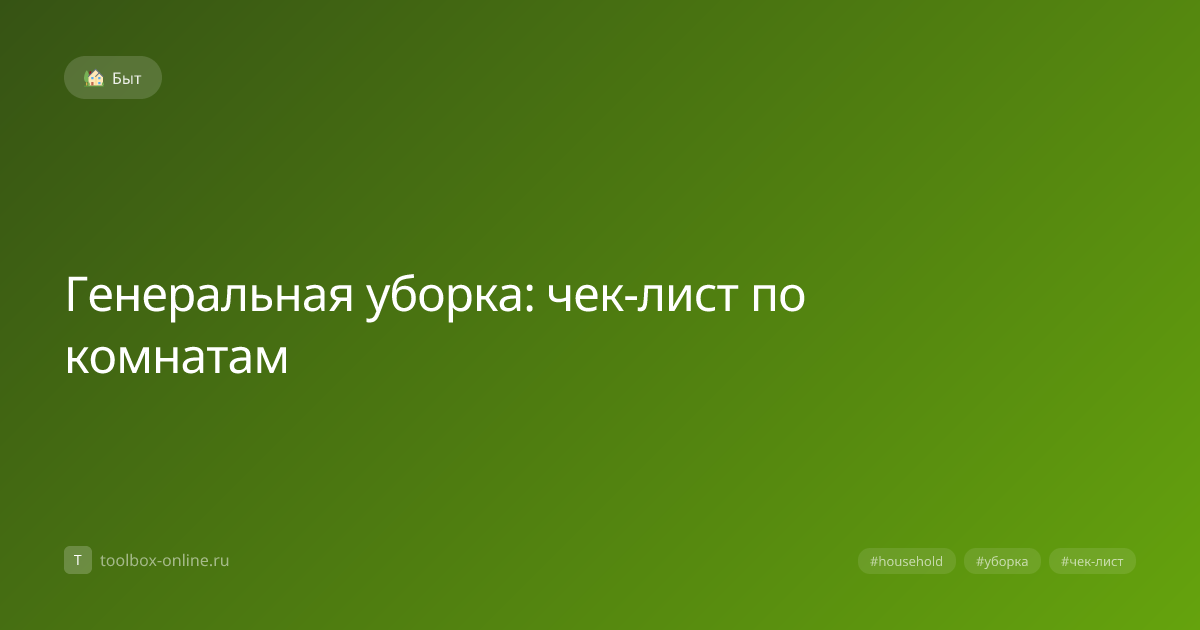 Убирайте сверху вниз, от дальнего угла к двери. Сначала разберите вещи, потом пыль, потом пол. Выделите 2–4 часа и подготовьте все средства заранее. Делайте мини-уборку каждый день по 15 минут: протереть столешницу, разложить вещи, пропылесосить одну комнату. Тогда генеральная уборка раз в месяц занимает 1–2 часа вместо целого дня. Рассчитайте количество обоев для ремонта с помощью нашего калькулятора.