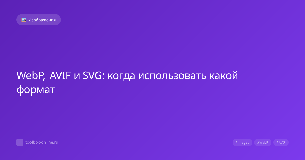 Разработан Google. На 25–35% легче JPEG при том же качестве. Поддерживает прозрачность (как PNG) и анимацию (как GIF). Поддержка браузерами — 97%+. Идеален для фото на сайтах. Векторный формат для иконок, логотипов, иллюстраций. Масштабируется без потери качества. Можно анимировать через CSS. Не подходит для фотографий. Фото → AVIF (или WebP). Иконки → SVG. Скриншоты с текстом → PNG. Анимация → WebP или MP4. Конвертируйте изображения между форматами с помощью нашего онлайн-конвертера.