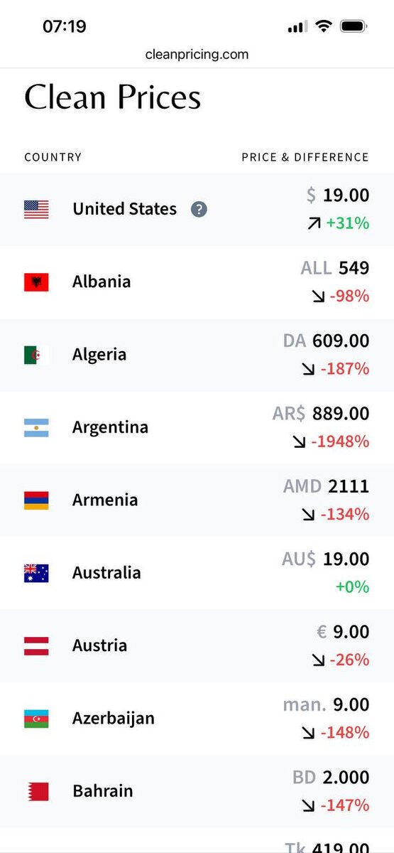 В тему ценообразования кидаю сайтик, который юзаю для адаптации прайсинга под разные гео: https://www.cleanpricing.com/ Здесь можно привести цену в базовой валюте к ценам в других странах с учетом их реальной покупательной способности. Если у вас завалялись подобные штуки тоже - скидывайте в комментарии: бенчмарки по CAC, конверсиям и любым другим метрикам будут полезными.