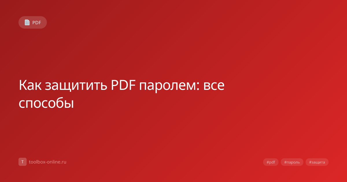 Договоры, сканы паспортов, финансовые отчёты — всё это отправляется в PDF. Пароль защищает документ от несанкционированного доступа при пересылке по почте или в мессенджерах. Пароль на открытие — без него файл не откроется. Пароль на редактирование — файл открывается, но нельзя копировать текст или печатать. Для надёжной защиты используйте оба. Защитите PDF с помощью нашего онлайн-инструмента — шифрование AES-256.