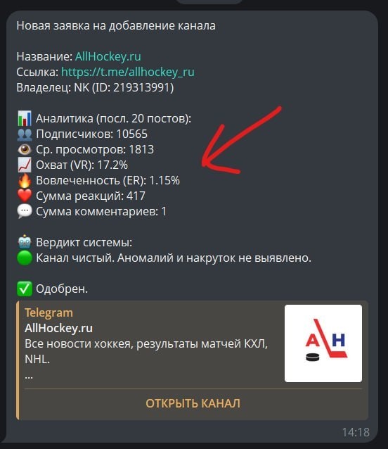 Хорошие и плохие (сетки, накрутки и т.п.). Мы сразу даем им бесплатно бота ретрансляции в MAX, но дабы не связываться с мутными каналами сделали систему аналитики, чтобы выявлять мусорные источники. На картинке подсветил что анализируем - вовлеченность, охват и т.п. Вот, недавно подключился канал про Хоккей (большой, 10к подписчиков). Это все бесплатно. Вот тут дока. Скоро уж 100+ каналов будет. Тафик растет, надеюсь будем и органикой делиться с владельцами каналов. @clickfraud.ru