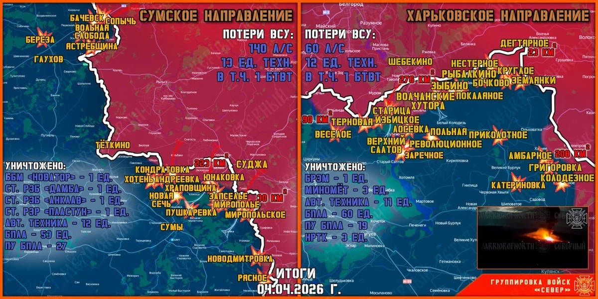 На Курско-Сумское направление командование Киева кидает солдат из тыловых районов. По информации телеграм-канала «Северный Ветер», завершившие базовую подготовку солдаты 17 механизированной бригады, которая ранее была разгромлена под Бахмутом и Авдеевкой, переброшены на Теткинский участок фронта. Также часть из них прикомандированы к 47 омбр ВСУ, выполняющей задачи южнее Юнаковки, близ курской границы. Штурмовики Северной группировки с тяжелыми боями двигаются вглубь Сумской области. Войска РФ нанесли удары по скоплениям солдат и техники ВСУ в районах Запселья, Ястребщины, Песчаного, Пушкарёвки, Чернигова, Вольной Слободы, сёл Хотень и Очкино. При этом в Шосткинском районе враг не отказывается от намерений отбить утраченные позиции. Но штурмовики Северной группировки, сломив упорное сопротивление ВСУ, продвинулись до 200 метров на двух участках. В Краснопольском районе без существенных изменений, отмечают военкоры.