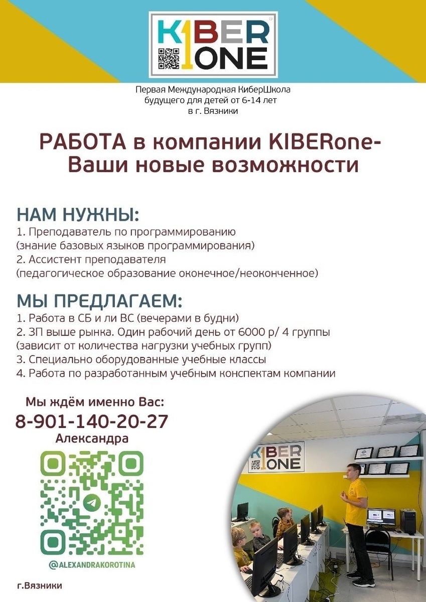 🤗 Детская школа программирования KIBERone г. Вязники ежедневно пополняется новыми учениками, мы активно растем и развиваемся, открываем новые учебные группы и готовимся к насыщенному летнему сезону! Команде нужны новые таланты! Мы приглашаем Вас или Ваших друзей/знакомых работать вместе с нами.