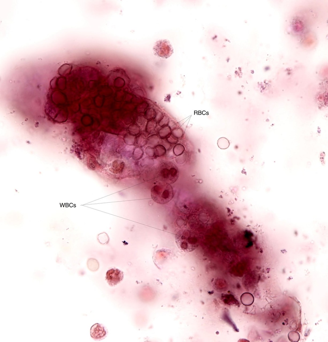Эритроцитарный цилиндр (и несколько лейкоцитов). Светлопольная микроскопия, окраска по Штернгеймеру-Мальбину. Объектив 100x.