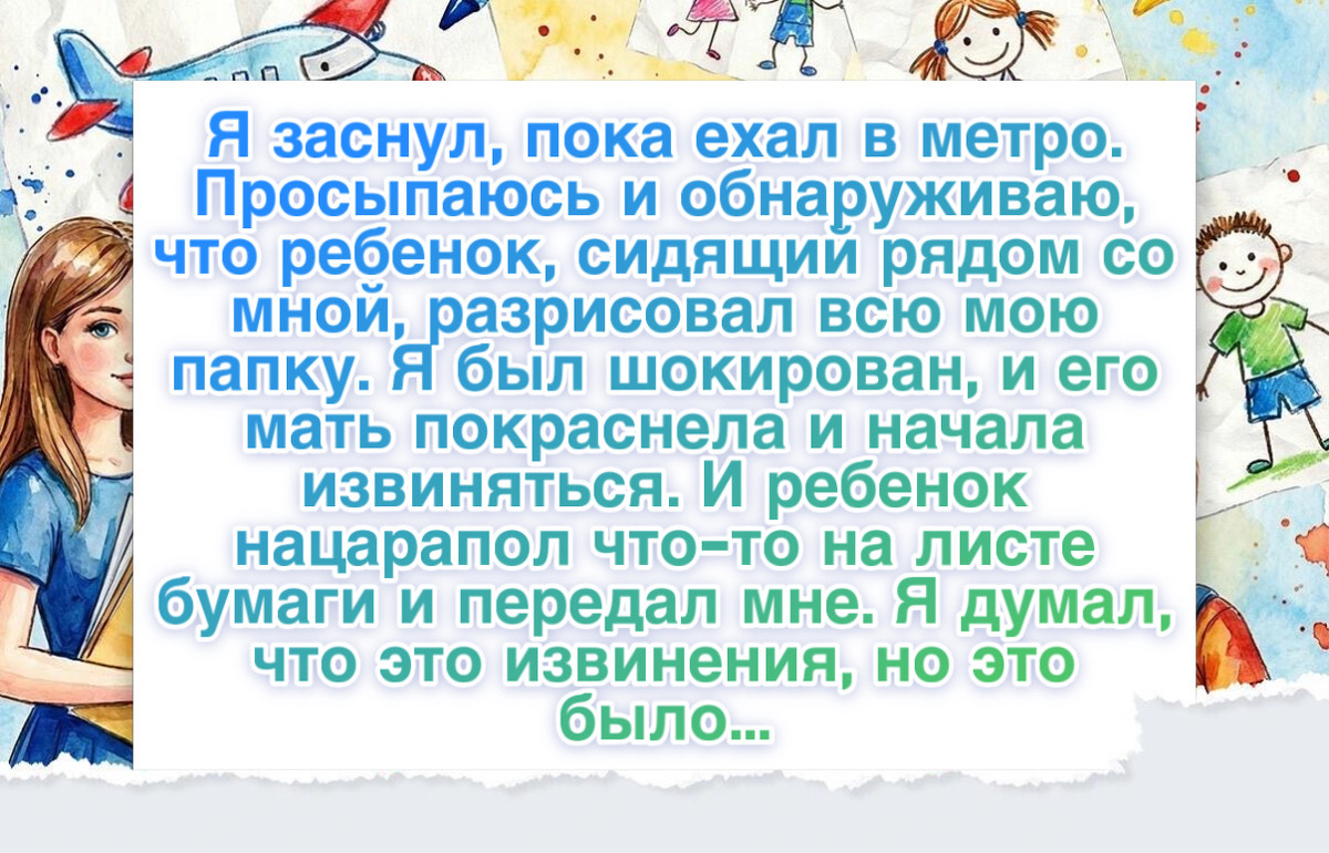 “Ехал в метро на собеседование и уснул. Проснулся, а ребенок, который сидел рядом, разрисовал мою папку с документами фломастерами. Я в шоке, мама его покраснела, извиняется. А ребенок что-то еще рисует, потом протягивает мне листок. Я думал, там извинение, а там написано кривыми буквами: «Это самолет для красивых людей. Вы красивый», и показывает на мою папку. Я посмотрел, а на папке действительно что-то вроде самолета. Я так растрогался, что пошел на собеседование в отличном настроении и получил работу.”