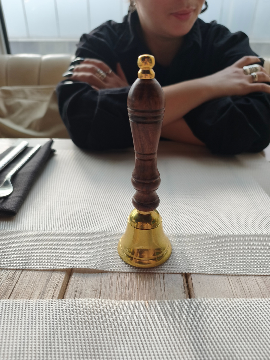 Колокольчик нужен для вызова официанта. Признаюсь, что делать это было крайне неловко. 1-обращаешь внимание всего зала на себя, 2-унижаешь достоинство обслуживающего персонала играя в барина. Но, концепт есть концепт, по этому по залу раздался "звоночек".