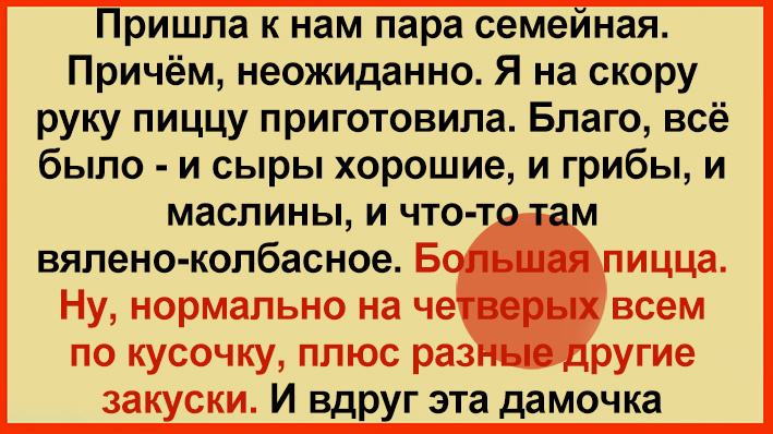 Ну, нормально на четверых всем по кусочку, плюс разные другие закуски. И вдруг эта дамочка заявляет, что она пиццу не ест! Ну, и сиди голодная! А пицца оказалась прям на славу! Вкуснейшая! Мужья наши её кусок с удовольствием доели. А уж потом выяснилось, что она думала, что пицца - покупная, потому и есть не стала. А знала бы, что домашняя...