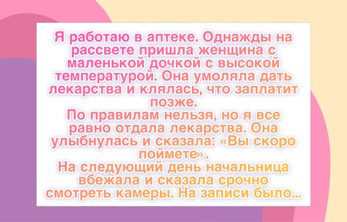 “Я работаю в маленькой аптеке в раннюю смену. Однажды на рассвете пришла женщина с маленькой девочкой с высокой температурой. Она умоляла дать лекарства и клялась, что заплатит позже.