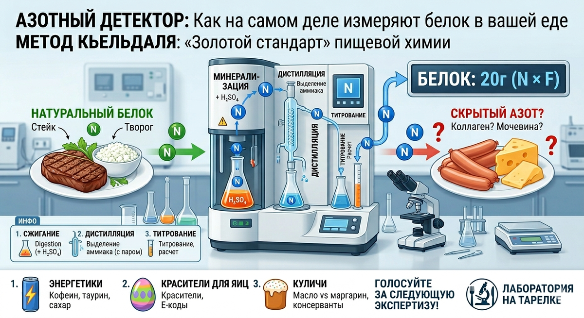 Это «золотой стандарт» пищевой химии, который основан на одном факте: белок — это единственное макровещество, содержащее азот. Измерив количество азота, мы можем математически вычислить количество белка.