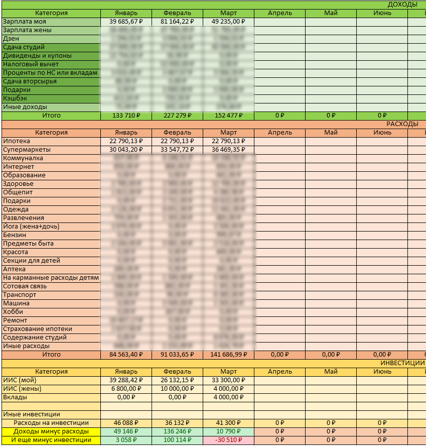 Приветствую вас на моем канале. Буквально пару дней назад я написал на своем Премиум-канале статью, в которой я подвел итоги марта по нашим семейным доходам и расходам. И так получилось, что подытожил сразу 3 месяца. Те кто имеет там подписку, все уже прочитали, и все знают в деталях. Ну а для всех остальных я приоткрою лишь общие цифры, и ту часть, которую вы итак уже знаете.
