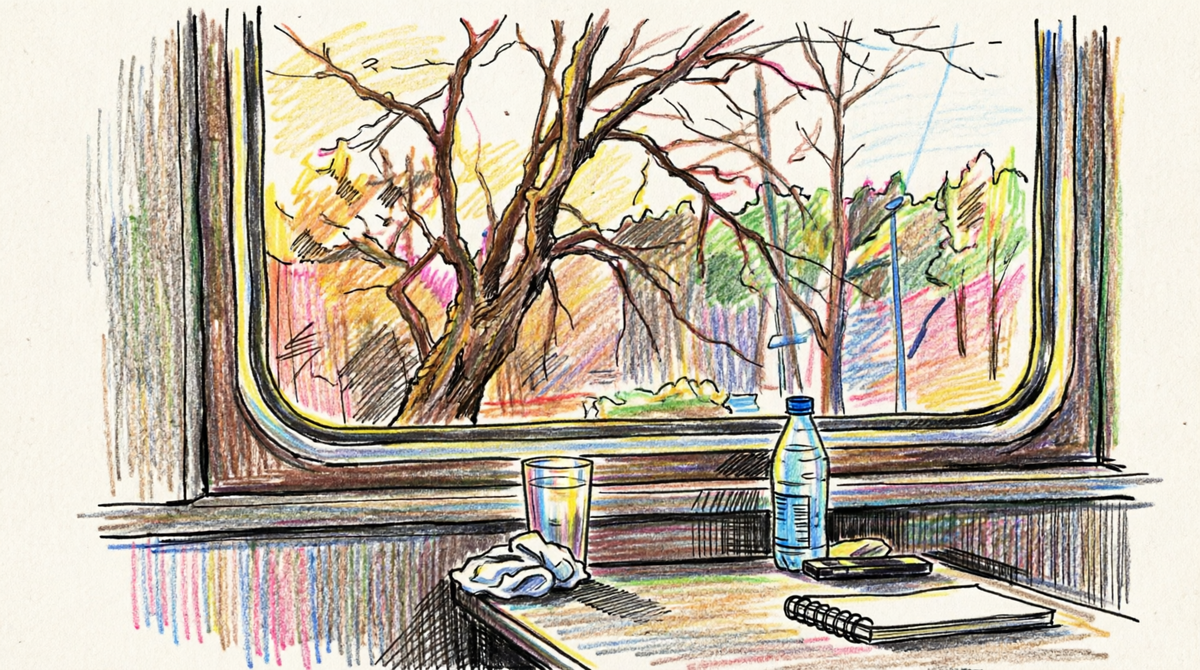 Сегодня хороший вечер. Настолько хороший, что мне досталась нижняя боковая полка в плацкарте. А на столике… о чудо из чудес! Трафарет шахматной доски! Прямо как в настоящем турнирном зале, только вместо кресел — полки, а вместо люстры — тусклый светодиодный светильник, который мигает в такт колёсам.