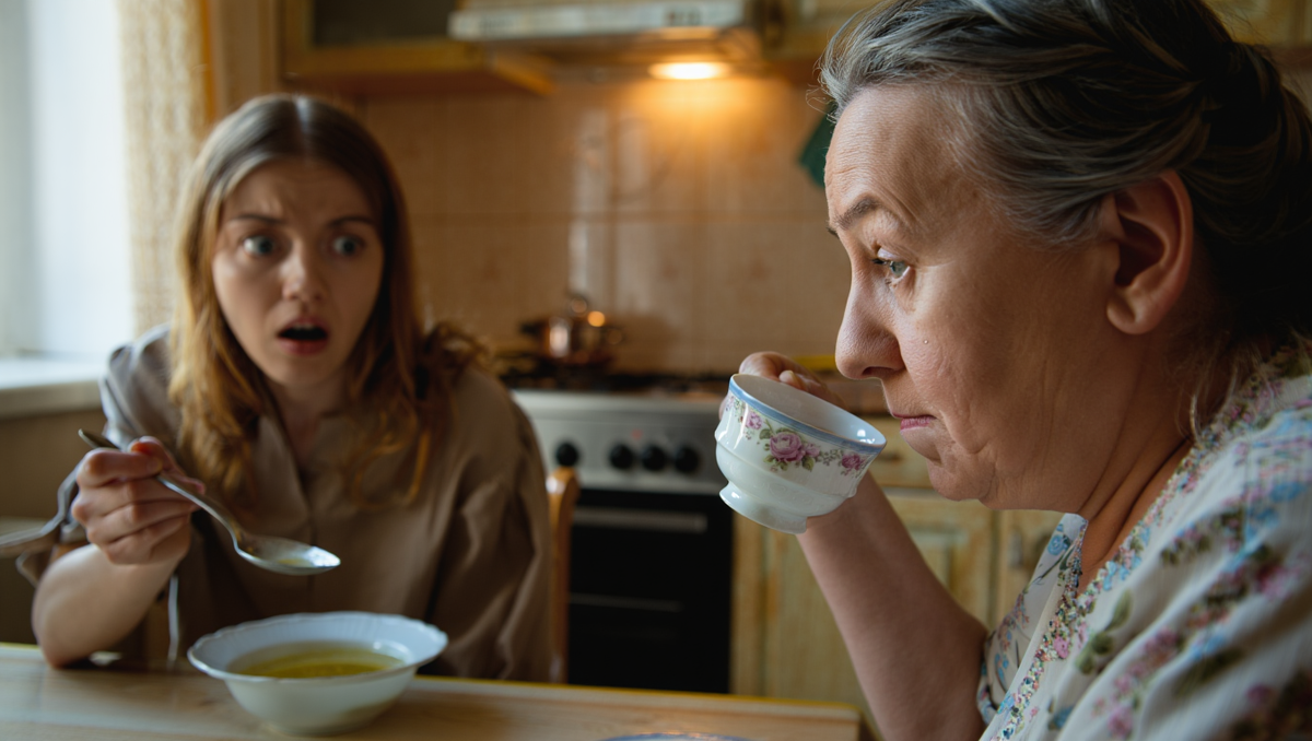 Катерина замерла с ложкой супа на полпути ко рту. Капли горячего бульона упали на скатерть, оставляя жирные пятна. Она медленно опустила ложку обратно в тарелку. Звук металла о фарфор прозвучал слишком громко в тишине кухни.