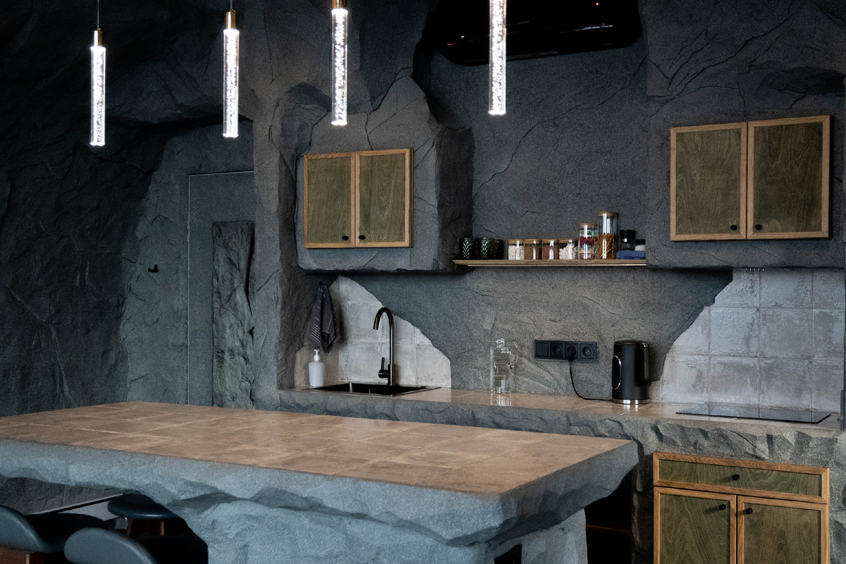 "ПАХНЕТ ЛЮКСОМ. Дело не в запахе, а атмосфере. Ощущение что попал в другую реальность. Совсем не ждешь от Тулы такого" - Так описали свои первые впечатления от пребывания в Пещере гости. Сам дом 52м2. Львиную долю занимает кухня-гостиная. Вы не ослышались. Кухня. Не чайный уголок. На кухне есть индукционная плита. Нормальная, не плитка на ножках, а встроенная, как дома. А над ней полноценная вытяжка. Питьевая вода из скважины во всех кранах. Безлимит по горячей воде. Электрочайник.