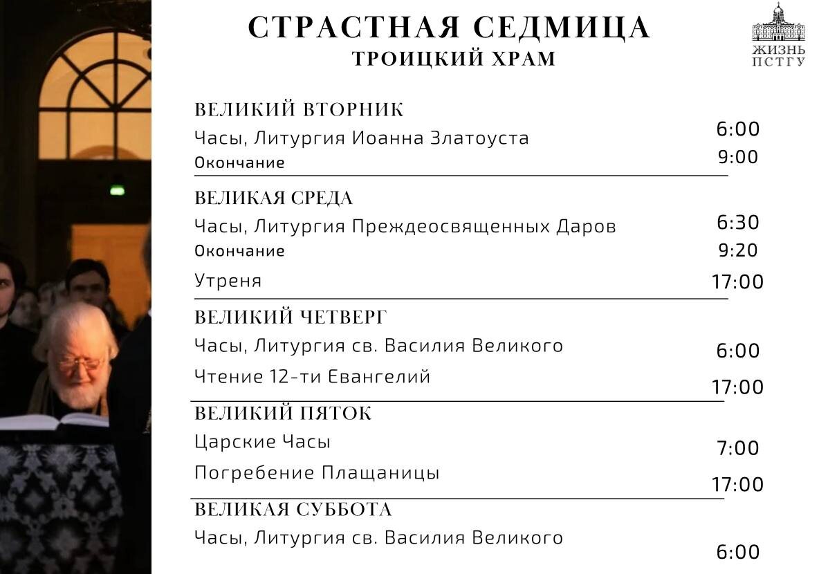 … Этими словами Церковь уже ведет нас от Креста к Воскресению. Впереди главные дни в году. Публикуем расписание богослужений Страстной седмицы и Светлой Пасхи в Николо-Кузнецком, Троицком и Князь-Владимирском храмах ———• Также приглашаем на общеуниверситетский молебен у мощей святителя Тихона на Благовещение Пресвятой Богородицы, в день преставления небесного покровителя университета. 📅 Вторник. 7 апреля ⏱️ 14:30 📍Большой собор Донского монастыря. Молебен возглавит ректор ПСТГУ и ПСТБИ епископ Егорьевский Мефодий, ему сослужит президент ПСТГУ протоиерей Владимир Воробьёв и сонм духовенства. 🇷🇺 «Жизнь ПСТГУ» в Мах