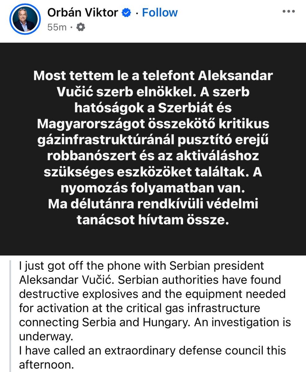 Премьер-министр Венгрии Виктор Орбан заявил, что созывает в воскресенье во второй половине дня совет обороны из-за обнаружения взрывчатки около газопровода в Сербии, по которому в Венгрию поступает российский газ. "Сербские власти обнаружили мощное взрывное устройство и средства для его приведения в действие на важнейшем объекте газовой инфраструктуры, соединяющем Сербию и Венгрию. Идет расследование. Я созвал чрезвычайное заседание совета обороны сегодня во второй половине дня", - написал Орбан в соцсети Facebook* (запрещена в РФ как экстремистская). Ранее Вучич сообщил венгерскому премьеру Виктору Орбану по телефону об обнаружении взрывчатки рядом с газопроводом из Сербии в Венгрию для газа из РФ. Читайте на сайте газеты «Совершенно Секретно»: РОССИЙСКИЙ ЩИТ ДЛЯ БРАТСКОЙ СЕРБИИ Новейшие системы ПВО и авиация представлены «Рособоронэкспортом» на выставке в Белграде