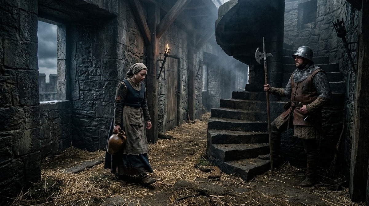 После заката крепость не превращалась в тихое место с мягким светом свечей. Где-то ходил дозор, хлопали двери, лаяли собаки, фыркали лошади, кашляли люди, плакал ребёнок, а на кухне могли ещё догорать печи. Ночь в замке была темнее, чем у нас, но тише далеко не всегда.
