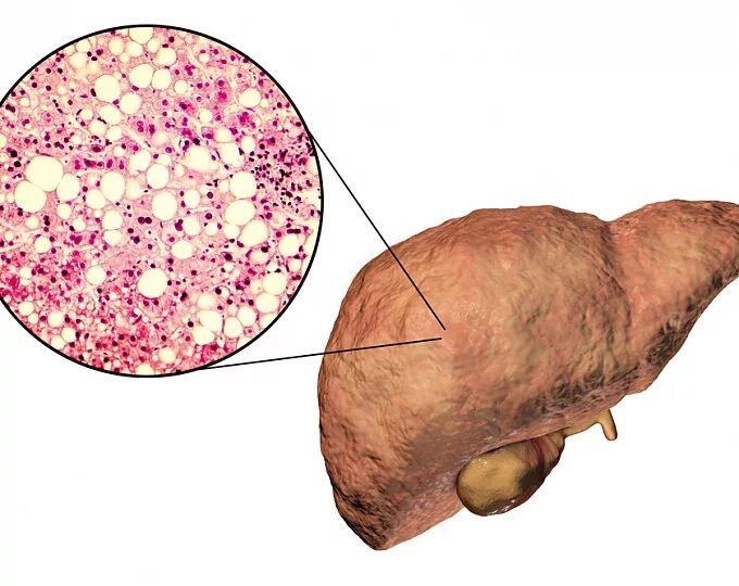 1. Жировая болезнь печени (стеатоз). Поскольку печень постоянно занята алкоголем, жиры перестают сжигаться и откладываются прямо в клетках печени. Это первая стадия к циррозу, и она обратима только если прекратить пить.