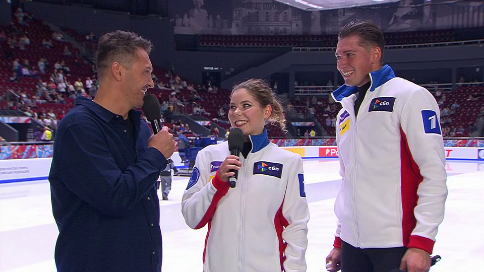 Анастасия Мишина - Александр Галлямов взяли тему авиации. Первая половина программы исполняется под песню «Стюардесса по имени Жанна», в роли которой выступает Настя. Вторая под «Чито гврито», где зажигает Саша. Было и техническое наполнение, и сюжет. На мой взгляд, известная история по содержанию и музыкальному сопровождению оказалась сильнее актерской игры фигуристов. Смотрелось простовато, и в отдельных моментах – тяжеловато. Но это, конечно, дело вкуса. Видим, как голосование фанатского сектора буквально «вытащило» пару на третье место, сместив Максима Транькова и Татьяну Волосожар. Саша сразу приободрился и заулыбался. А то был совсем поникшим в КиКе. Дуэт также был оценен, как лучшая спортивная пара. А вот Максим Траньков дал свой совет молодым спортсменам: