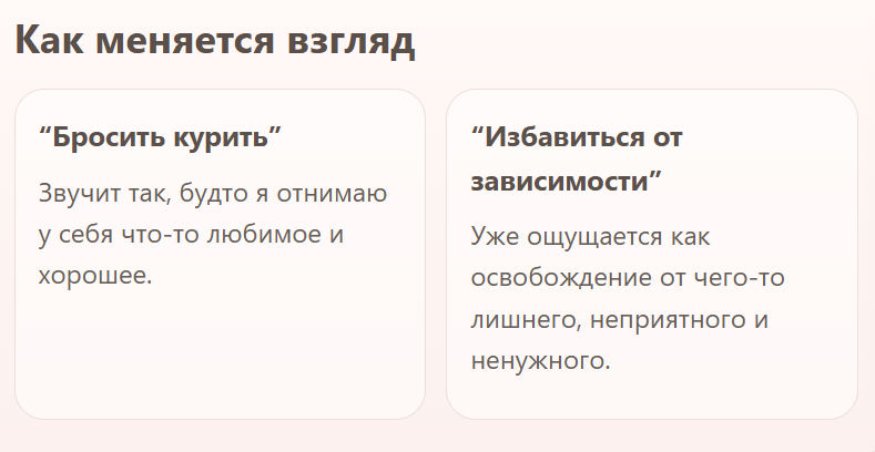 Есть одна мысль про курение, которую я считаю очень точной. Смысл в том, что основная проблема не столько в физической ломке, сколько в голове. То есть мы привыкли думать, что сигарета нам что-то дает: успокаивает, помогает собраться, снимает стресс, заполняет паузу. Например, мне сигарета позволяет сконцентрироваться и думать. Но это обман, в который мы сами же и верим. “Бросить курить” звучит так, будто я у себя отнимаю что-то приятное и любимое, как будто лишаюсь поддержки. А вот “избавиться от зависимости” ощущается уже совсем иначе. Не потеря, а наоборот, освобождение от чего-то лишнего и неприятного. Курение - это не удовольствие на самом деле. Если вспомнить самую первую сигарету, вряд ли кому-то было вкусно) Скорее всего противно и горько. Просто потом возникает замкнутый круг: сигарета снимает неприятное состояние, которое сама же до этого и создала. Получается, ты не удовольствие получаешь, а на время убираешь дискомфорт и так по кругу. Есть такое убеждение у курильщиков, ч