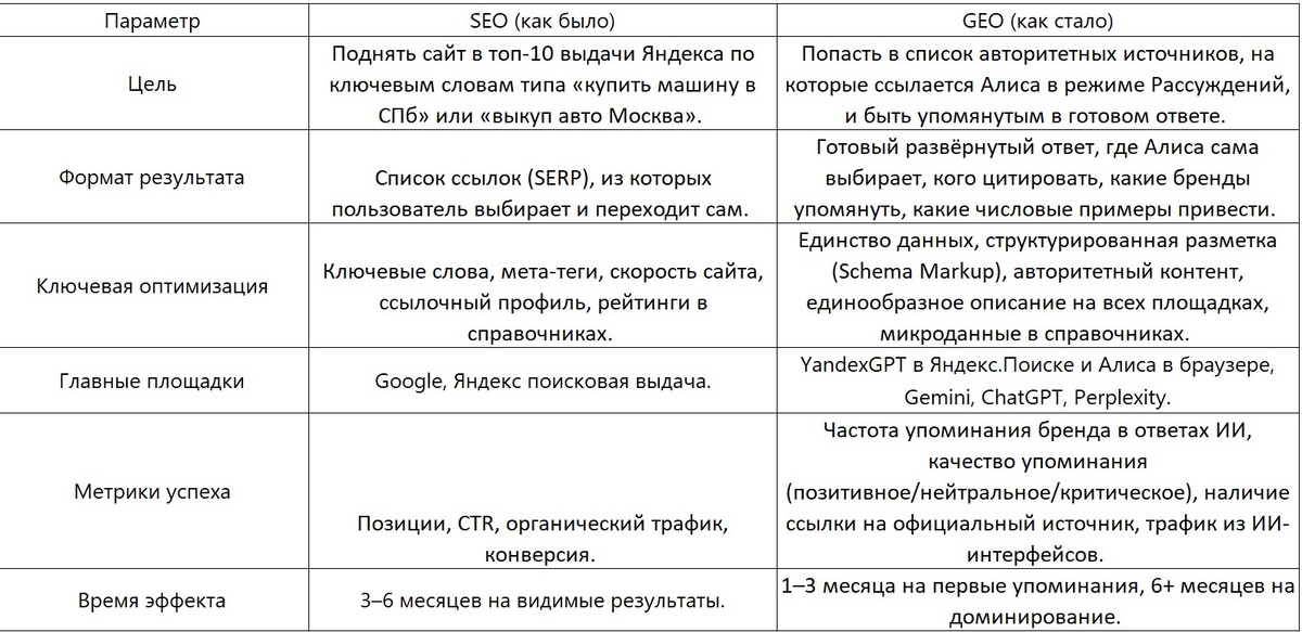 · SEO ориентируется на ключевые слова и клики, GEO — на факты, структуру и авторитетность источников.