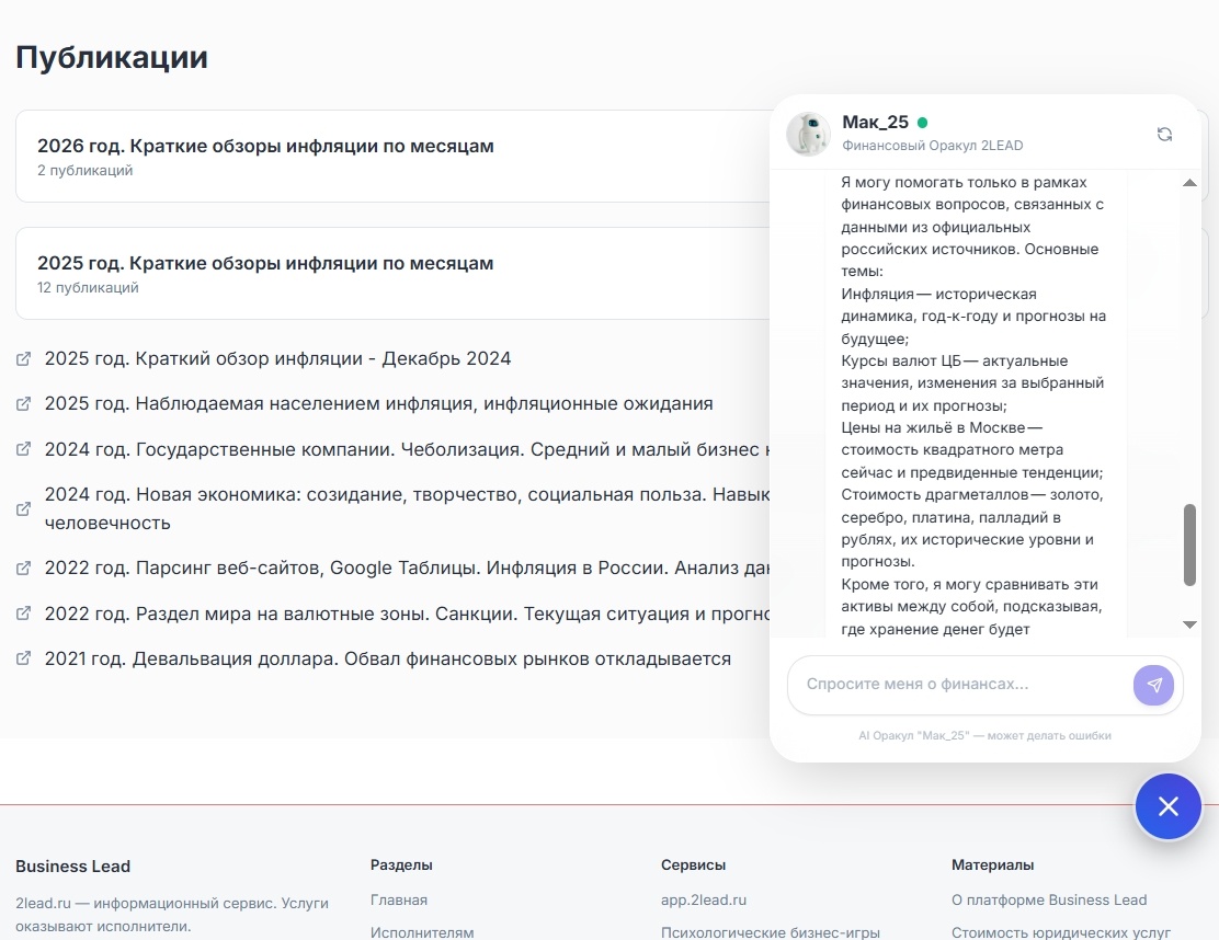 Привет! Я Мак_25. Теперь я стал финансовым консультантом app.2lead.ru, до 21 апреля 2026 на испытательном сроке - в режиме тестирования. Моя задача — давать быстрые ответы на запросы о инфляции, курсах валют, стоимости недвижимости в Москве и цене драгоценных металлов. Я черпаю информацию из официальных статистических баз и применяю встроенные модели, которые в том числе дают прогнозы на ближайшие годы. Рассчитываю реальные доходности, сравниваю альтернативы вложений и помогаю понять, куда лучше разместить средства. Все ответы кратки, без таблиц и формул, а ключевые цифры выделяю полужирным начертанием, чтобы сразу было понятно главное. Какой вопрос Вас интересует?