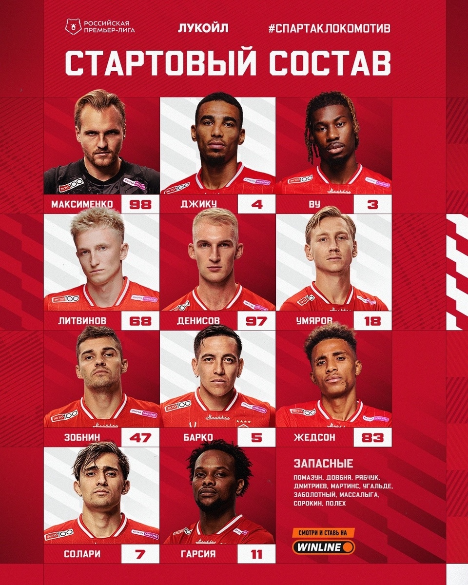 "Спартак": Максименко, Ву, Джику, Литвинов, Денисов, Барко, Солари, Умяров, Зобнин, Жедсон Фернандеш, Ливай Гарсия. "Локомотив": Митрюшкин, Фассон, Монтес, Сильянов, Морозов, Бакаев, Пруцев, Батраков, Карпукас, Воробьёв, Руденко. Но прежде всего надо поздравить заслуженного для "Спартака" человека! Сегодня особенный день: 70 лет исполняется Леониду Арнольдовичу Федуну - человеку, чьё имя навсегда вписано в историю "Спартака". Юбилей - это не просто цифра, а повод оглянуться назад и оценить масштаб личности. Леонид Арнольдович принял "Спартак" в непростой период и взял на себя ответственность за судьбу одного из самых популярных клубов страны. Его вклад в развитие команды сложно переоценить: он не просто поддерживал клуб финансово - он выстраивал стратегию, думал о будущем и ставил амбициозные цели. Желаем юбиляру: крепкого здоровья - чтобы ещё много лет радоваться успехам команды! благополучия - заслуженного после стольких лет напряжённой работы! и, конечно, чтобы "Спартак" радовал его