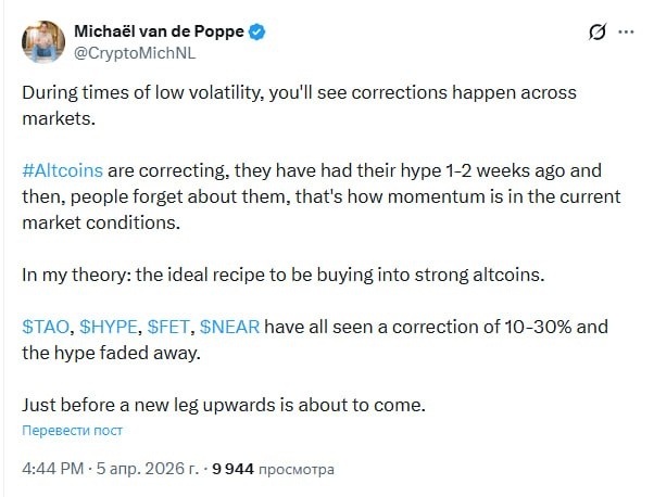 Альткоины корректируются — их хайп был 1–2 недели назад, а потом люди о них забывают. Так сейчас устроена динамика рынка. По моей теории: это идеальный рецепт для покупки сильных альткоинов. $TAO, $HYPE, $FET, $NEAR — все они скорректировались на 10–30%, и хайп вокруг них угас. Как раз перед тем, как начнётся новый рост.