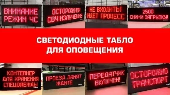 На основе информации с сайта https://groundsport.ru, вот подробные данные о табло для оповещения от компании «Индустрия Света» (торговая марка «РусИмпульс»): ### 📋 Основное описание Табло для оповещения — это информационные светодиодные табло с фиксированными текстовыми надписями предупреждающего характера. Ключевые особенности: | Параметр | Описание | |----------|----------| | Режим работы | Статичный (в отличие от бегущих строк), отображение одной надписи | | Примеры надписей | «Тревога», «Авария», «Берегись поезда!», «Высокое напряжение», «Работает кран», «Прямой эфир» и др. | | Управление | Стандартно — включение при подаче питания 220В / 50 Гц; опционально — различные варианты управления | | Минимальный заказ | от 3 штук | | Гарантия | 2 года на электронные табло «Импульс» | ### 🎨 Доступные цвета свечения - 🔴 Красный - 🟡 Жёлтый - 🟢 Зелёный - 🔵 Синий - ⚪ Белый - 🟣 Пурпурный ### 📦 Примеры моделей в ассортименте | Модель | Габариты | Высота символов | Наличие | |--------|