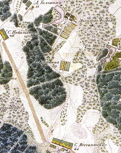 📷 Фото 1: Старинная карта окрестностей Москвы XIX века с обозначением деревни Коптево. Район тогда был глухой, но стратегически важной подмосковной территорией.